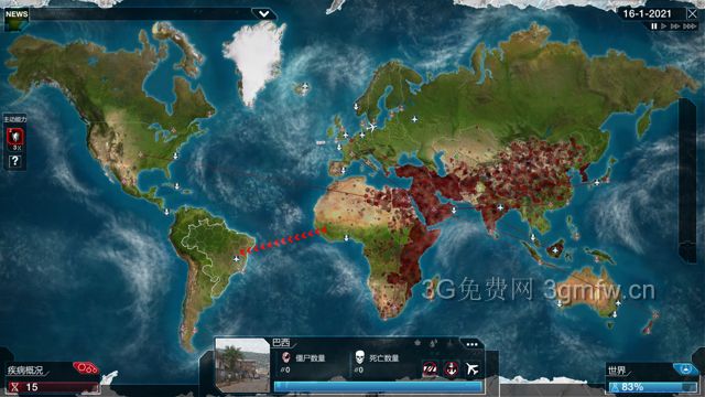 等僵尸数量有所上升时,移动僵尸到未感染的国家(这局我没控制好解药,导致很多已经感染的国家没出僵尸)