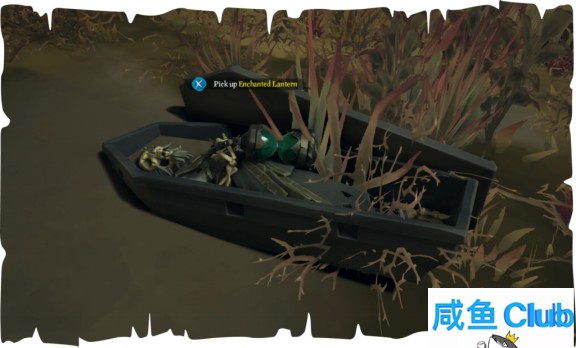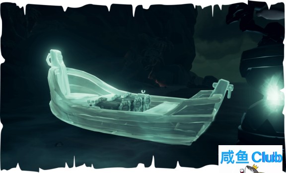 步道始于南海滩。拉出灯笼并将其抬高以显示场景。您应该碰到一个划艇,里面有几个箱子。附近是一个大骨架,上面有几个小骨架。