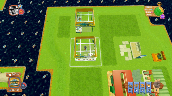 如图,只要把鱼市场建筑摆成前后连通,再往前是鱼池的区域。周期性地向前走一段距离捕鱼,连续捕鱼1分钟之后往后退回鱼市场里自动卖鱼(因为鱼市场的冷却时间是1分钟),循环以上操作就可以挂机收获大量经验、金币和钻石资源。