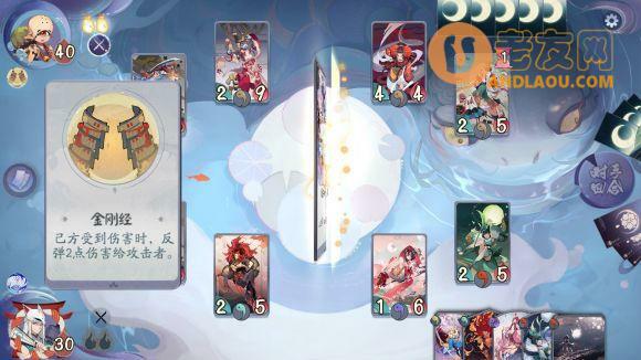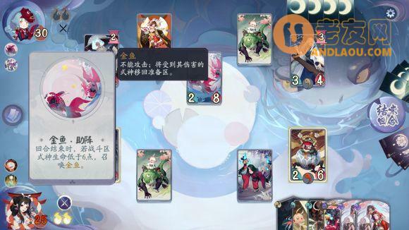 第一关花鸟打金鱼姬,金鱼姬的卡组是倒计时打脸卡组,技能为回合结束时召唤一个28的金鱼,金鱼不能攻击但是会把受到其战斗伤害的式神打回准备区