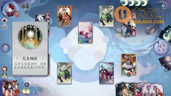 回合开始时如果金鱼在场则金鱼姬的式神倒计时-1,这个技能就导致了我方式神前期完全站不住场面而被高速抢血,这里根据花鸟的技能推荐骰子流(花鸟卷在判定成功时给己方所有角色回2血)