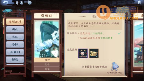 新笑傲江湖手游福州郊外-引魂灯【引灯】奇遇任务攻略 激活条件:完成主线:[江湖评价] 从福州城某出寻得奇怪的包裹 解决方式:轻功飞上二楼地上有个小包裹拾取 完成奖励:表情拍桌,绑元X20 老友网www.andlaou.com免费为你分享