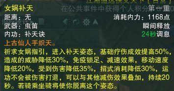 女娲补天:简称女娲,爆发技能,持续时间内,加强我们的治疗量,并且附带减伤效果。使用方式:在没有蝶池的时候爆发抬血使用,或者不适合用蝶池的时候爆发抬血使用。