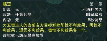 蝶鸾:碧蝶宠物的技能,是奶毒的驱散技能,必须有蝴蝶才能用。使用方法:蝴蝶在场的时候,需要驱散时使用