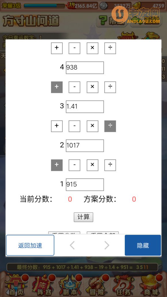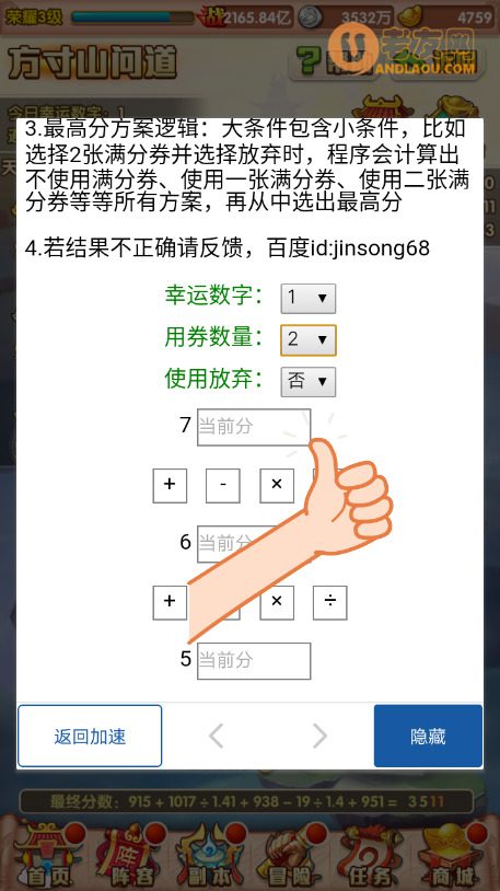 500元宝,我们就算刷新了10次也是有赚的,嫌麻烦的可以保留2个的,然后每刷新一次我们就计算一次,因为打了的分数已经保留了,所以我们只输入刷新了的那2个分数,看看有没有两个相同的数字,我们的前提是保证500元宝+7个令牌,毕竟一个月1.5万元宝是不是,挺香的