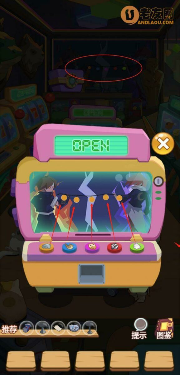 各个按键对应不同的灯,点击按键,可以变换灯的颜色,灯的颜色参考框中的彩灯颜色。这里为了方便大家,我把所有颜色组合都排列出来(从左至右),变换成功后,会产出道具,并且游戏结束。