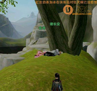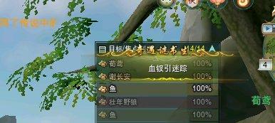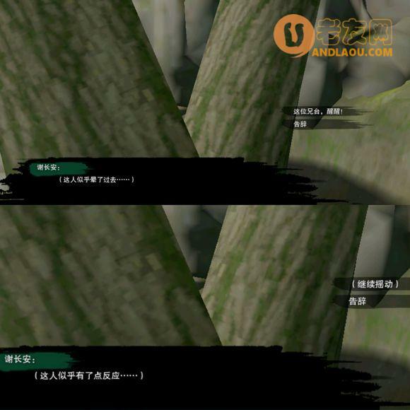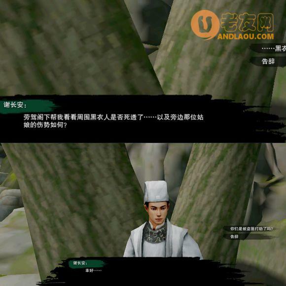 按F键互动,触发剧情以后,界面跳出提示,地上有血迹,沿着血迹 发现附近的一棵树,树脚躺着两个人,周围倒下几个黑衣人,对话树脚下的两个npc 谢长安和荀鸢。 【血钗引迷踪】