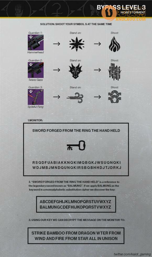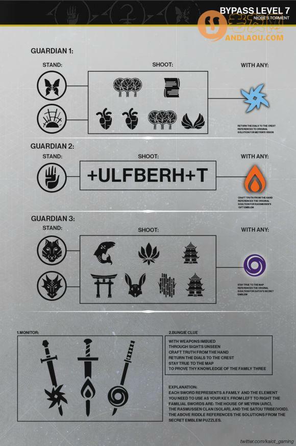 解谜之前建议先清完所有「强大的敌人」(黄血)和「一般的敌人」(红血),只留下「首领」(橙血),这样不会再刷新小怪干扰解谜,解谜部分和之前一样,三人独立解谜,互不干扰。第七阶段需要玩家使用「恶毒尖牙」「吹炉注目」「坚硬锤头」的瞄镜,先观察符号(当然你要是记住直接射也行),然后再切换其他「非可视武器」(也就是说不能是上面3种武器)射击。