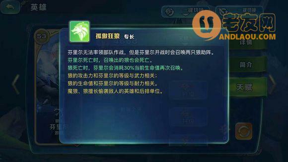 另一种玩法是当做一个刺客来用,主点大招,用狼王变身魔狼会偷袭敌方英雄和后排单位的特性如果时机好的话,先偷掉关键英雄,可以瞬间改变战局。在PK和竞技场比较推荐这种打法。个人喜欢把狼王放在边角上,在前面几个技能就狼王开大突入后排,自身技能携带的吸血效果和项链神器的吸血效果,可以让狼王变身魔狼的30秒内疯狂输出。