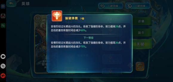 连续送头,又称强健体魄,此技能可以极大减少快乐送头男的重伤时间,别的英雄送头之后需要很长时间养伤,50级甚至需要8个多小时,而快乐送头男只需要不到一个小时的时间(实际测试时间减少远远超过技能描述,不知道为啥,但是没关系,这样更加快乐),就可以继续送头,然而美中不足的是,此技能还增加了大量耐力,导致送头变慢,不够快乐,但是为了能连续送头,建议学满,不快乐玩家也要学满,pk增加45耐力呢