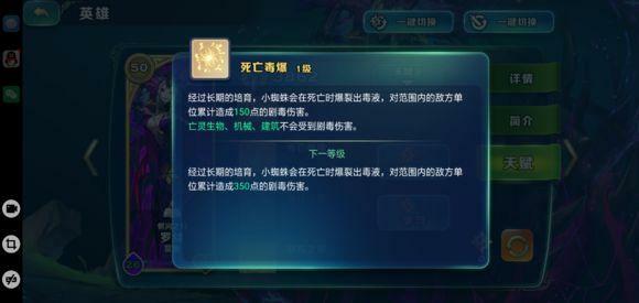 此技能强化了小蜘蛛的输出能力,死后会自爆,对生物单位有较大杀伤,值得一提的是此技能学习后不光是罗丝的小蜘蛛会自爆,其他蜘蛛部队的小蜘蛛也会自爆了,还是巫妖族学习后收益最大,不过有更多其他更好的技能,而且局限性也大,对于免疫毒素的部队几乎无用,此技能个人平时不点