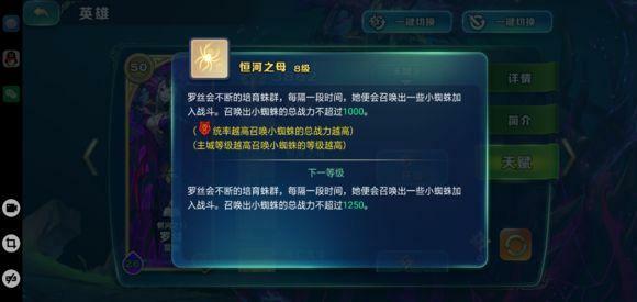 罗丝的下崽技能,每隔一段时间指从开场8s召唤第一波蜘蛛,此后每隔10s召唤一批,这个技能打的时间越久收益越大,同样小蜘蛛吃甘的光环,巫妖的蜘蛛科技以及罗丝自己的专精加成,此技能和大招建议二选一,需要开场大量肉盾的主学大招,需要持续源源不断肉盾学此技能,此技能的小蜘蛛可以吸收不少火力,很不错的技能