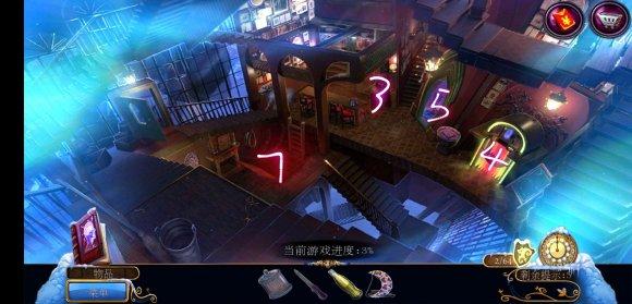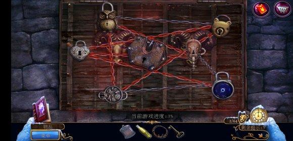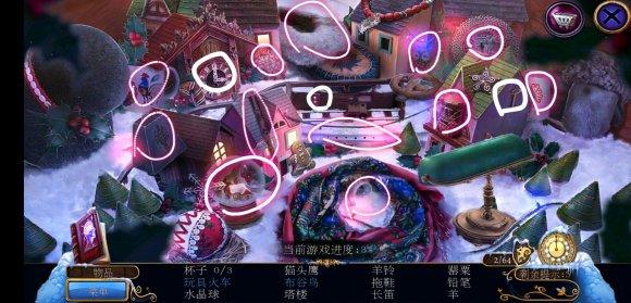 小游戏如图一,进入另一个场景,左边,图二,人偶身上获得胸针,图三获得开瓶器,拿胸针,开透明袋子,获得指甲锉棉签,图四获得饮料,拿开瓶器起开,图五获得月亮,去图六获得门环,图六拿指甲锉,割铁线获得钥匙,钥匙开图七,拿饮料瓶子砸生锈的锁,获得破瓶子,去割图二人偶手臂,去图八,安装手臂,玩找东西小游戏,图中白色圈,钥匙开钟获得布谷鸟,点栏杆,使玩具火车停下,通过游戏获得台灯,把台灯灯泡取下来安装到,图三获得,另一个门环。