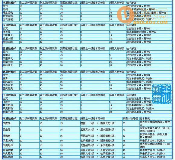 当一个人物掌握了多个系的仙术,并满足一定条件时(两个系的特定仙术达到一定等级并且人物也达到一定等级),还可以习得相应的双系仙术。(请看本楼图片)