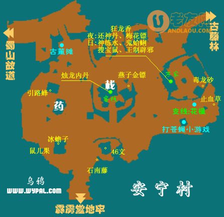 在西南尽头战古藤精,打前记得存盘(防止打不出尸块重打),用“炼狱火海”打!打出妖树刺后存盘,拾完其它物品了回头再拾土灵珠!古藤精HP为3800