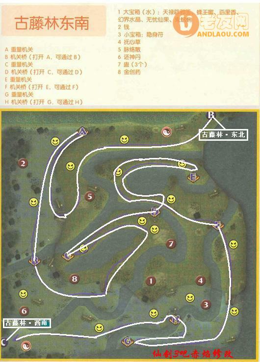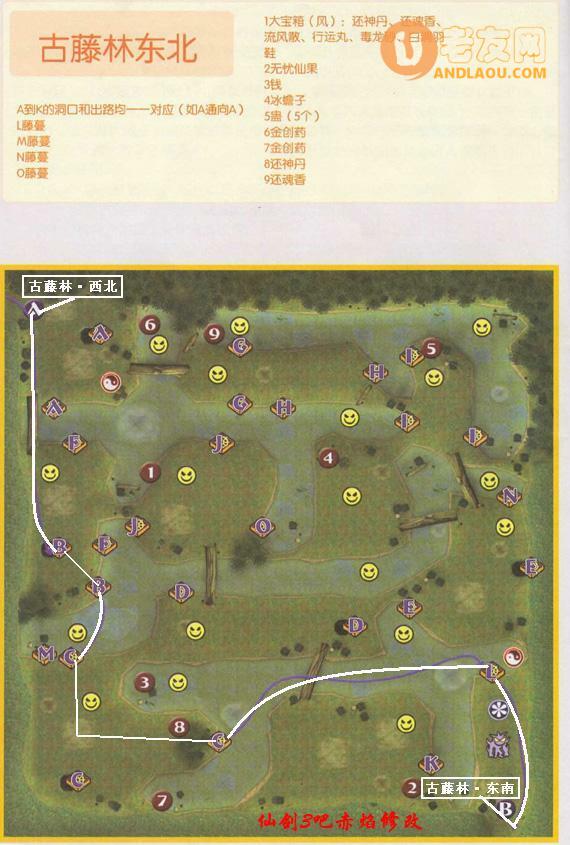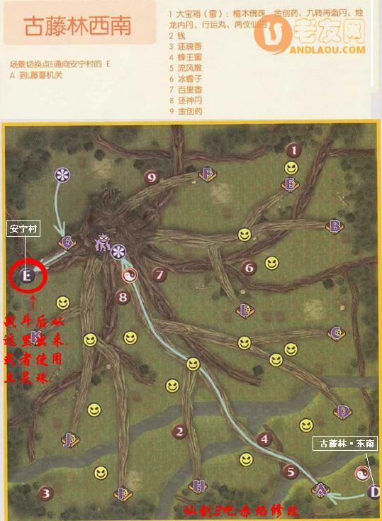 进入西北——西北迷宫尽头与万玉枝对话——向东去东北——在东北迷宫尽头战BOSS精精,对话后进入东南——东南迷宫尽头战BOSS古藤仙,对话后进入西南——西南树干中间战BOSS古藤精——捡土灵珠——战BOSS罗如烈——对话后存盘点西边离开