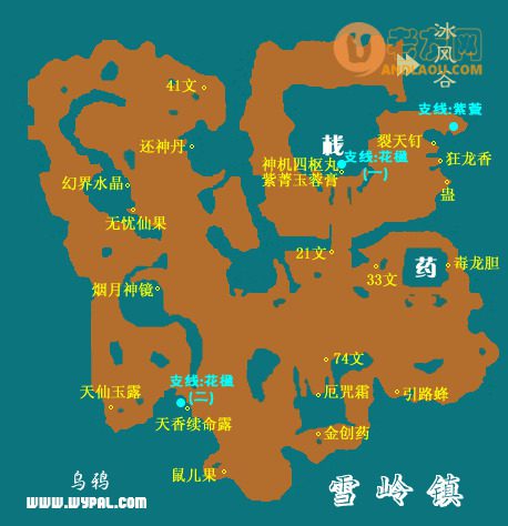 回蜀山去存放雪见尸体的房间——无极阁——雪岭镇——酒馆遇霹雳堂弟子——由雪岭镇入口出去至冰风谷