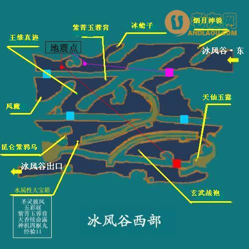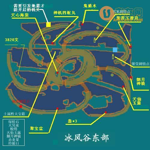 先由正东(三点钟方向)的冰道1滑下,就是一上楼梯就看到的那个,到了平地,逆时针绕道往西慢慢找,一棵树底下有个可加15%经验的聚宝盆, 然后爬回中央环形冰架(钻桥洞从内侧短道爬上)。然后走东南(五点钟方向)的冰道2,可触发地震机关,滑下去的地方和冰道1其实是一样的。再回中央环形冰架。走西南 (八点钟方向)的冰道3,向东走过桥洞,地上有个土宝箱。回到环形冰架,最后走西边(十点钟方向)的冰道4,滑下去之后向西走,去冰风谷西部。 环形冰架上正北方的那条冰道会回到早先紫萱受伤处,不用去了。