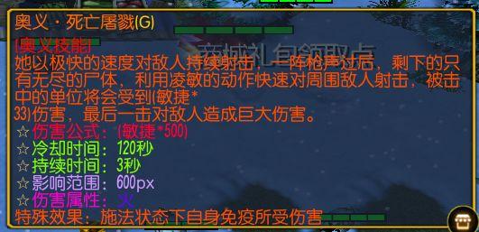 G技能,核心输出技能之三(谁的G不是核心技能呢)。范围写着600(平A也是600),实际比600稍微小一丢丢,伤害范围是以自己为圆心的圆。先控制加多段伤害2-3S,最后间隔0.5S左右后再炸一下。伤害不稳定原因之一,最后一段爆炸是否暴击。