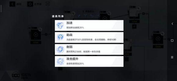 在特定副本可以获得特定道具,可以获得加成效果,在每个章节内部,界面上方的四个圈内会有显示