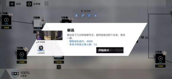 MI2限制出场人数为一人。关卡内共有两波小怪,难度简单。第一波怪为两个信使,无特殊效果。第二波怪为一个信使,当玩家将信使的打到血条低于一条多一半时,便会触发审讯状态。此时怪物不能攻击但会自动回血(复苏2级别?),玩家需要连续打击信使20次,以完成审讯并获得道具,直接打死不掉道具;并且一旦信使血线高于此值,则会立刻脱离审讯状态,连击数重新计算。由于审讯效果的特殊性,建议选择人物的攻击力不要太高也不要太低,建议1500战力左右即可。