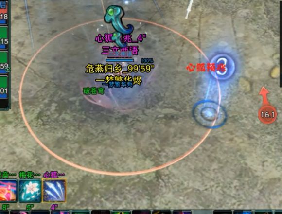 溜剑到一半的时候boss会出心狐技能,点名一部分玩家造成aoe伤害,不要跟其他玩家重叠,否则会造成多次伤害,炸完以后还会有持续掉血的debuff