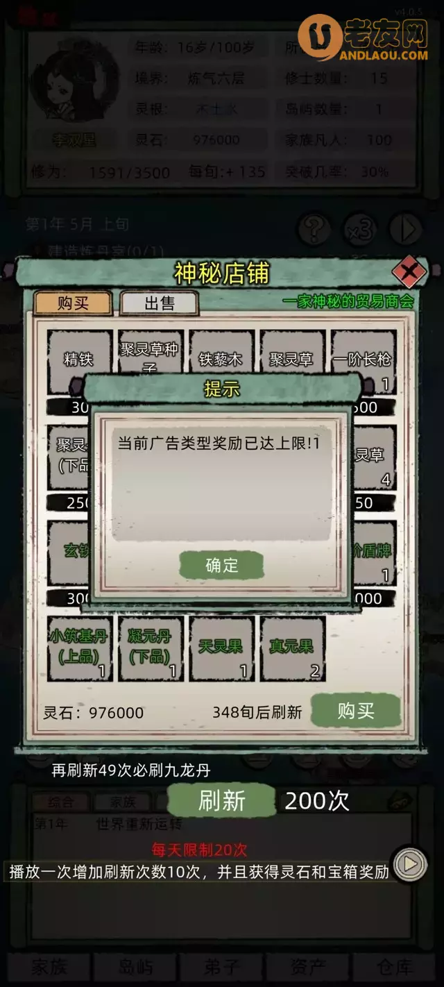 我是这局当天所有广告看完,放一边,第二天再看,就能凑够200万灵石升三级天道台。