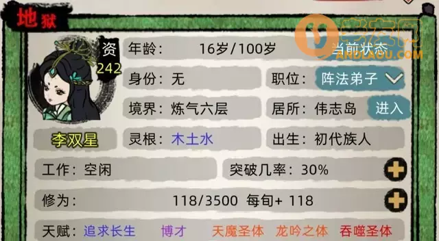 最后说博才和追求长生,其实如果能随机出紫色的天生神魂或者七窍玲珑心更好,但是很难,建议不要在这上面浪费功德了。追求长生在坐聚灵阵时候有概率+100%修炼速度,维持一年。