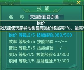 大家可以看到我的抬价技能是2级,也就是可以提高价格4%