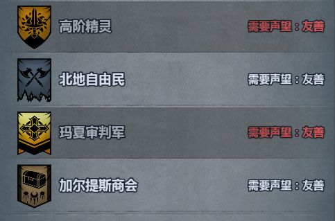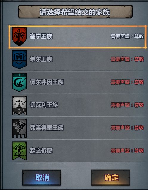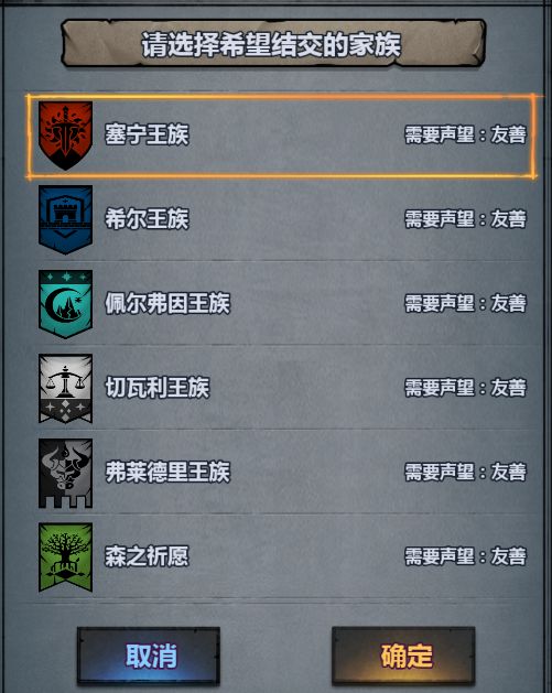 这是目前已知全部可以结婚的派系,不过都需要对应的声望才行,最低为友善,骑士,最高为尊敬公爵,公爵以下信赖即可。