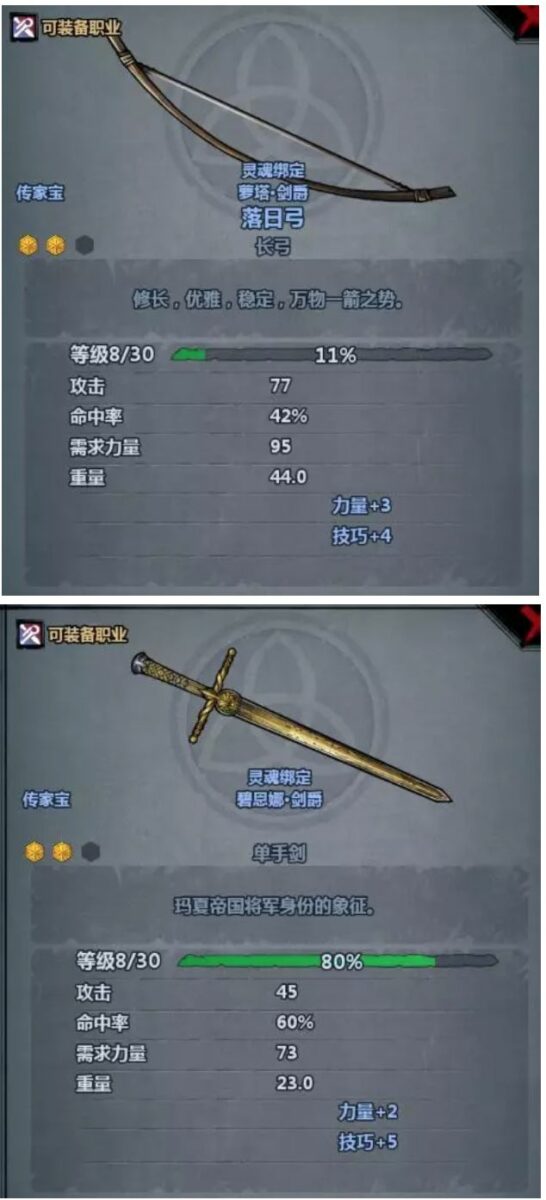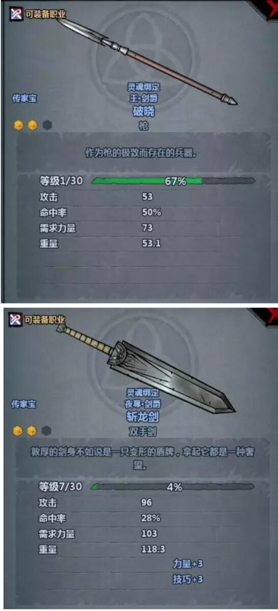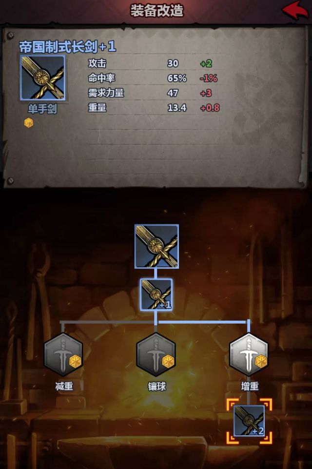 掏出一把剑,点击淬火(强化)后出现三个途径,效果已经给出来了,只有增重可以增加攻击力,增重前这个攻击力29是此剑的标准攻击力,可以发现增重后它的攻击力发生了一些变化。注:每次强化增加的攻击力是固定的,所以我们可以在武器+1阶段进行重塑,重塑改变的只是增重带来的攻击力。上文提到过单手剑的上限是标准值+4,所以我们可以把这把剑在+1状态重塑到33攻击力(欧皇可能点一下增重直接33攻了,就不需要改动了因为已经到达上限)。操作方式:重塑(淬火左边有个重塑)、重塑、重塑、重塑,回炉强化增重(重塑次数用完了还没达到上限时),重塑、重塑循环往复,玩家可能需要重塑上百次才能得到想要的结果,23333。下面给出几把重塑后的武器,对应开头给出的重塑上限值。