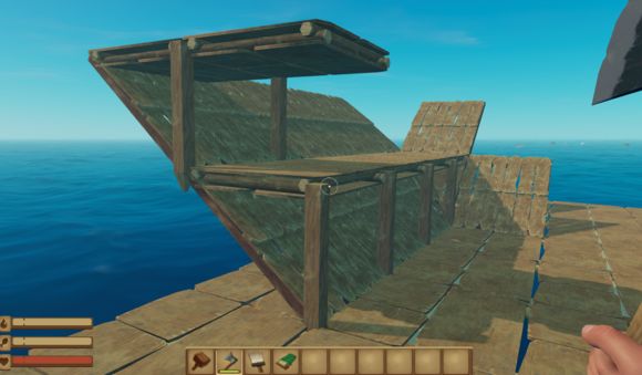 当我们得知 拍木桩后 可以在斜板上建造平台后 我们就可以造出真正的船舱了,不用再像大部分小伙伴们只会搭建正方形建筑了。如图1。我们将再以打过半截式木桩后搭建的平板上 内侧再敲上半截木桩从而搭建船的甲板。