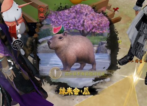 4、对话完毕,在闰水背后,右上角的地方有个小动物:水豚,我们跟这个水豚互动;