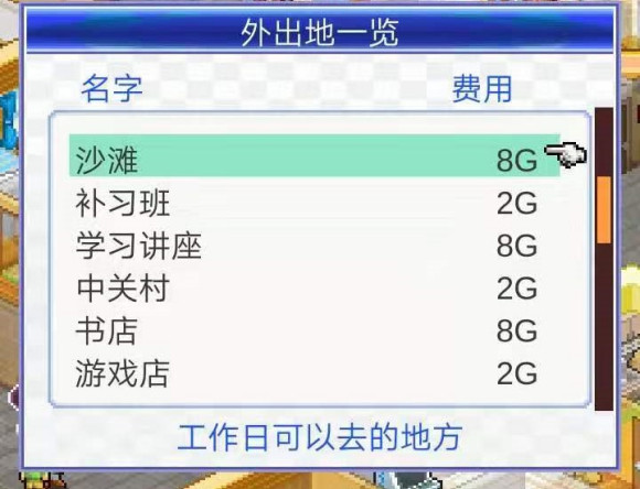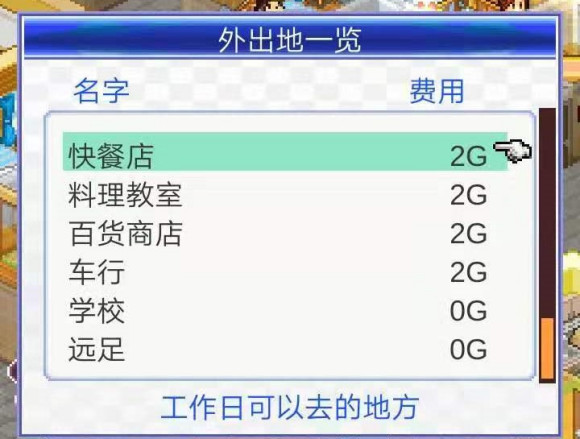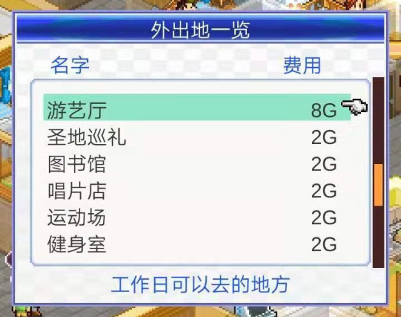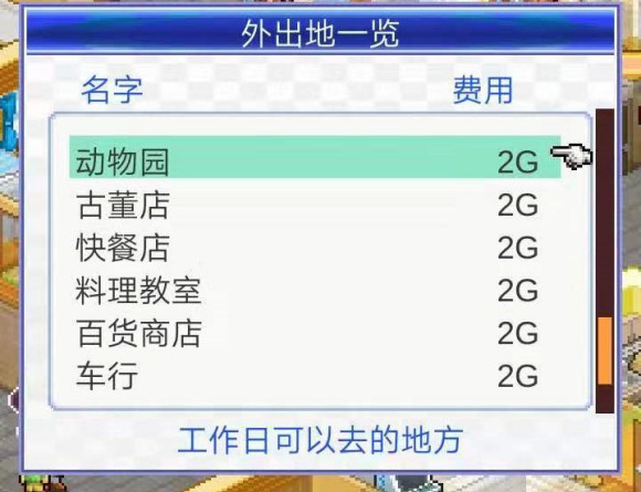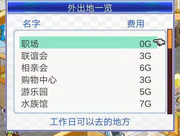 外出地种类会根据人物属性和职业增加,住民外出时会消费不等少量钱财,同时增加人物属性。