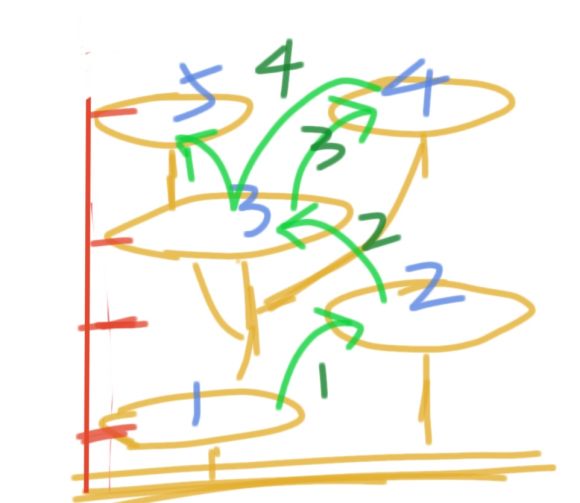 绿色线是跳法,1可以直接跳到2,2可以直接跳到3,3可以直接到4,4到5需要先往下跳到3,再从3跳到5。