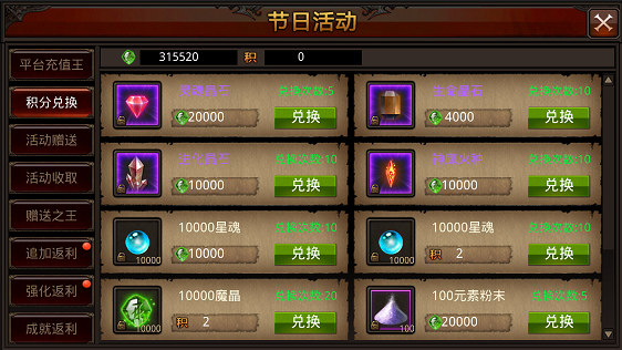 【爱神之光】*20 +【再造晶石】*1 = 合成【100狼魂粉末】*6,每日限兑10次