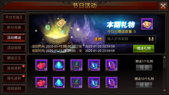 收取礼物达到10个:1000神迹积分*10+10附魔灵石*1+神佑晶石*3+黄金圣物大宝箱*20+圣印之灵宝箱*1