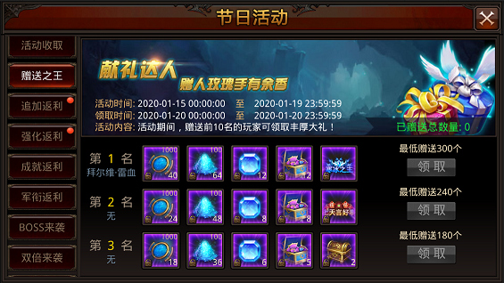 赠礼第1名可领取:1000神迹积分*40+100狼魂粉末*64+神佑晶石*12+坐骑圣印宝箱*12+称号:诸圣降临*1