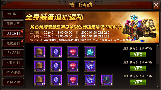 活动内容:活动期间,装备总追加达到指定等级可领取丰厚大礼