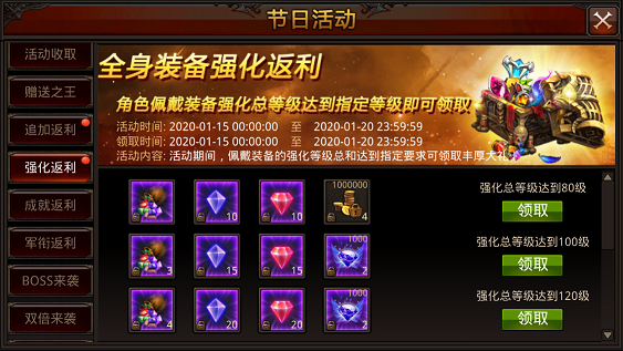 活动内容:活动期间, 全身强化总等级达到指定要求可领取丰厚大礼