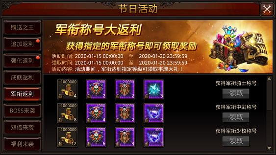 活动内容:活动期间, 军衔达到指定等级可领取丰厚大礼。