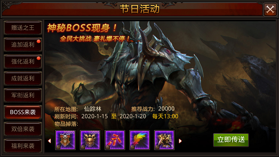 节日BOSS100%掉落:高级声望印记*1、高级成就印记*1、五响爆竹*1、四响爆竹*1、进化晶石*5、灵魂晶石*3、彩色羽毛*1、守护精华*2、30绑钻*5、黄金圣物大宝箱*5