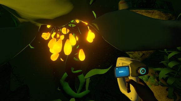 在逃生舱周围转一转,应该就能发现上图中远处那一根根一柱擎天的东西,那就是绿藻。进入绿藻区你会看见有些绿藻长着如图的黄色种子,这个东西使2x2的,很占地方,采两个就可以了。绿藻区还有盐块,也可以拿一两个,用来做水很方便。