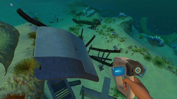 新手这时候可以回救生舱分解可回收金属合成一个氧气瓶了。而对自己操作有信心的人可以带着45点氧气继续探索,不过要控制好氧气和深度,一氧气可以上升三米。