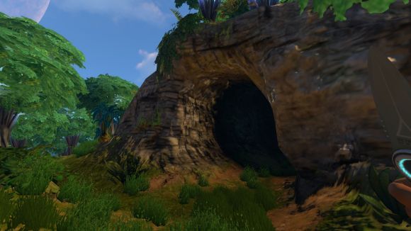 从这条路上去可以会遇到一些面包树,开局吃的饼干到这里也应该消耗得差不多了,可以砍一些面包树来充饥,记得留一个回去种,沿着路往前走可以看到一个山洞