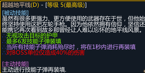 被动:攻击无视单位护甲拥有着输出手们所达不到的输出高度,作为制衡,攻击对boss造成40的伤害,以及6发一换弹的特点也是赏金的鸡肋之处。(ps:换弹有着1s的无法攻击时间)