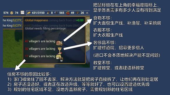 【三】每一项需求都会影响个人的幸福度数值,这里不细说具体算法。若有需求得不到满足,幸福度必定下降。其中可能导致住房不足的原因比较多,但是也比较好解决;而食物/衣物/奢侈品不足,通常都是由于产能不足,需要扩建生产线,某些情况也可能是由于物流不太行,需要扩建市场/仓库/粮仓。