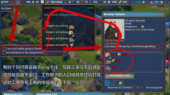 【四】左上角的报警栏一定要时刻关注,一旦出现“I am stuck while going to xxx”“我在去xxx的途中被卡住了”,我们就一定要注意了,要么清理装饰性障碍物,要么拆房子开路,反正不能让那位村民一直卡在原地。图中这位Brother Dickon因为bug被卡在了桥中间,这我也没办法啊,于是他就成为了上次河谷地图中唯一愤怒地离开了小镇的村民