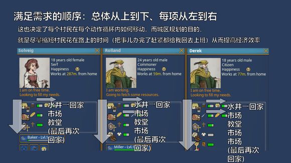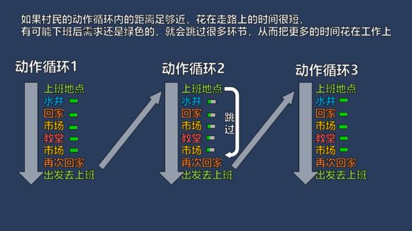 【八】细心的玩家还会发现,村民满足需求有时候并不是严格按照楼上说的那个顺序区走的,原因我们也讲了,因为这些需求的“能量槽”还处于绿色状态,还不需要被满足,就会在当前循环被“跳过”。能量槽的衰减是跟时间相关的,所以如果我们能让每个循环尽量用时最短,就能使村民“跳过”一些环节,赶紧回去上班