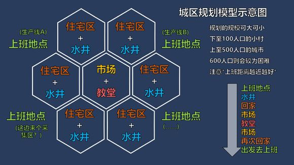【六】于是我们就有了这个规划模型:市场和教堂放在市中心,因为那是每个人都要去的地方。工作单位(生产线/采集区)放在小镇外围,因为大家都在不同的地方上班。住宅区和水井则要放在市场和工作单位中间,大概就是城乡交界处。这样规划,村民满足一项需求后,不需要走太远就可以满足下一项需求,效率比较高。